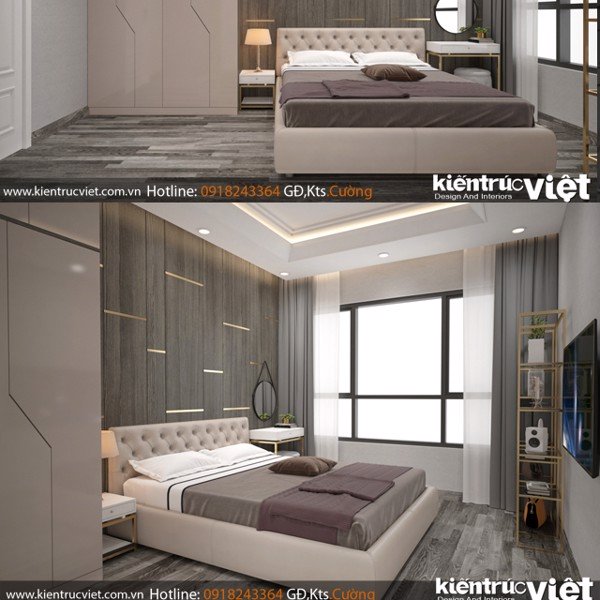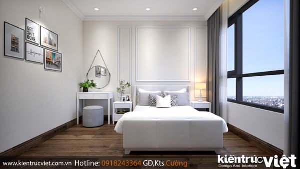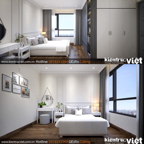 Không gian trang trí phòng ngủ 3 toàn cảnh tủ quần áo và hệ giường ngủ kết hợp bàn trang điểm, 2 tag đầu giướng