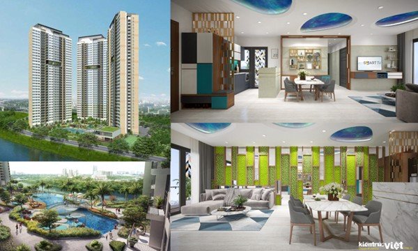 Nội thất không gian phòng khách và bếp căn hộ 100m2 giao thô tháp T2 Palm Heights Mái Chí Thọ, Quận 2
