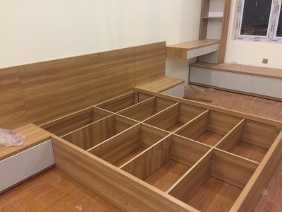 Vật liệu chính để thi công: bằng gỗ HDF, gỗ Melamine, gỗ tự nhiên 100%...