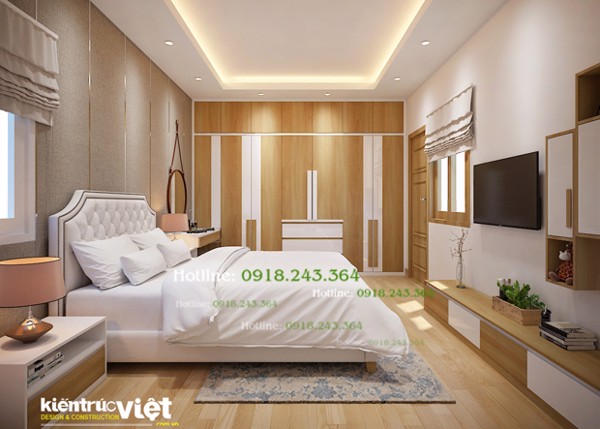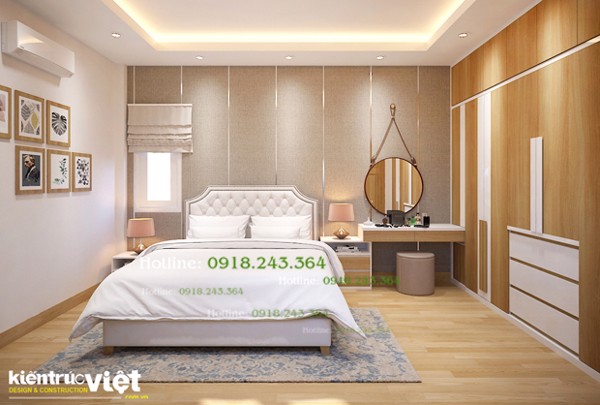 Mỗi phòng ngủ sẽ có phong cách khác nhau phù hợp với chủ nhân căn phòng và sở thích riêng của từng người. Trong không gian phòng ngủ của vợ chồng chị Vy thì vẫn tuân thủ theo phong cách hiện đại với tông màu sáng, nội thất tối giản và ưu tiên sự ấm áp để mang lại giấc ngủ ngon. Sự kết hợp giữa tông màu gỗ tự nhiên cùng màu trắng sáng giúp căn phòng trẻ trung và thanh lịch.