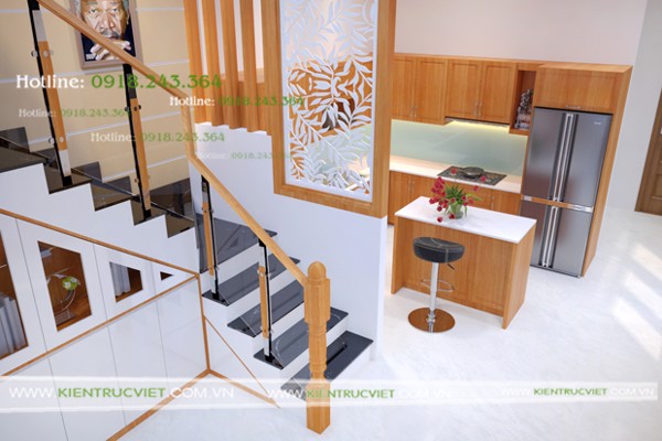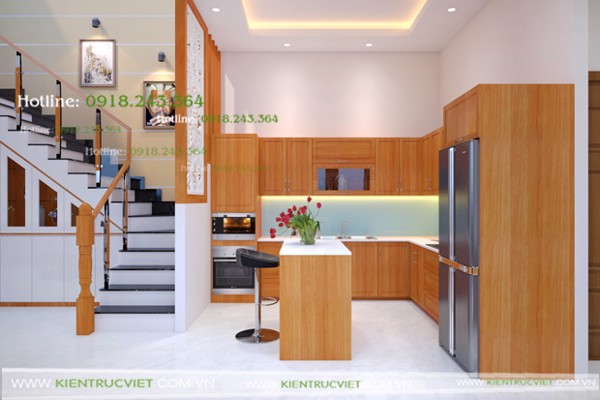 Trong thiết kế này thì không gian của bếp và khu vực bàn ăn nằm phía sau phòng khách và ngăn cách bởi một vách ngăn. Thông thường cầu thang dẫn lên tằng nằm cận kề đó nên đã mất đi một khoảng đất nhỏ, khiến thiết kế bếp bị lồi lõm không còn vuông vức và trọn vẹn. Vì vậy mà căn bếp hình chữ L được thiết kế để trả lại hình thức cho gian bế. Đảo bảo thiết kế sạch sẽ và gọn gàng, được trang bị nội thất bếp đầy đủ giúp người nội trợ có những giây phút nấu ăn tuyệt vời.