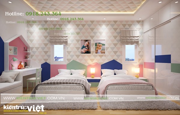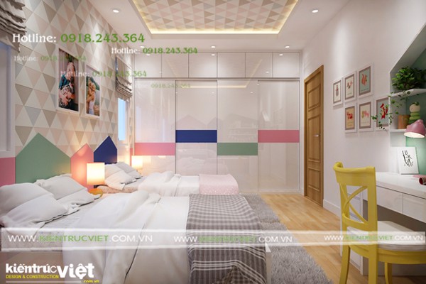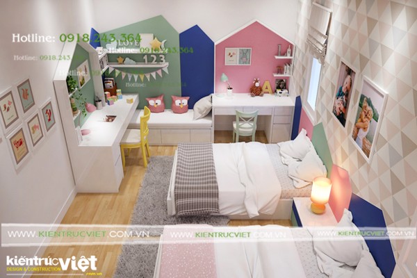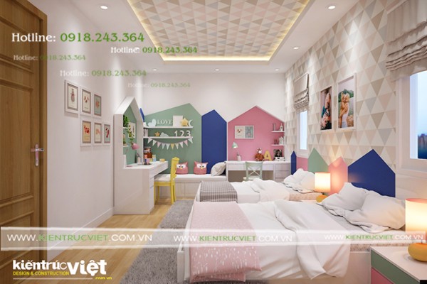 Khác với những bản vẽ khác thì nội thất nhà phố Thủ Đức này thiết kế phòng ngủ của con chung trong một căn phòng chứ không phân riêng ra nữa. Trong phòng ngủ này có 2 chiếc giường dành cho 2 bé. Diện tích tương đối rộng rãi, với những màu sắc đa dạng đáng yêu, phù hợp giữa khu vực nghỉ ngơi, học tập và vui chơi cho các bé.