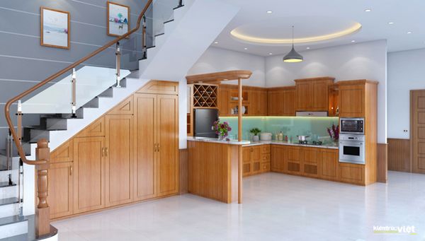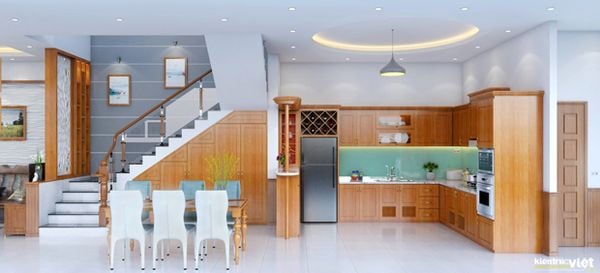 Không gian bếp với nội thất gỗ tự nhiên, kết họp bộ bàn ăn sang trọng.
