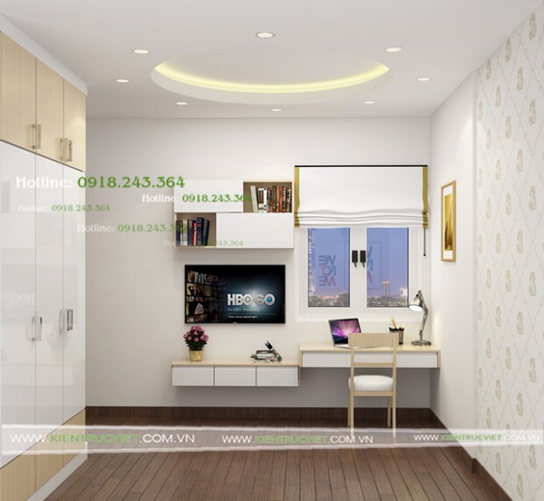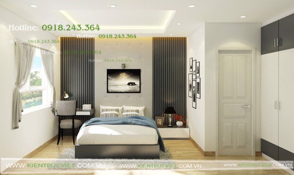 Thiết kế và thi công nội thất phòng ngủ cho căn hộ thô 2 phòng ngủ. Thi công hệ thống trần trang trí, đèn hắt sáng, tủ kệ giường trang trí như hình.