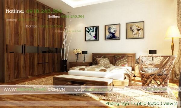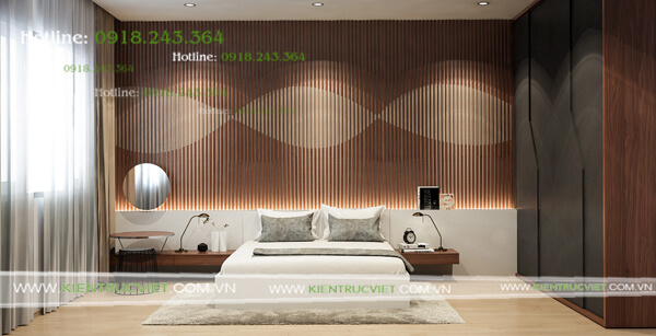 Phòng ngủ tầng 2 với mảng trang trí tường đơn giản nhưng rất ấn tượng