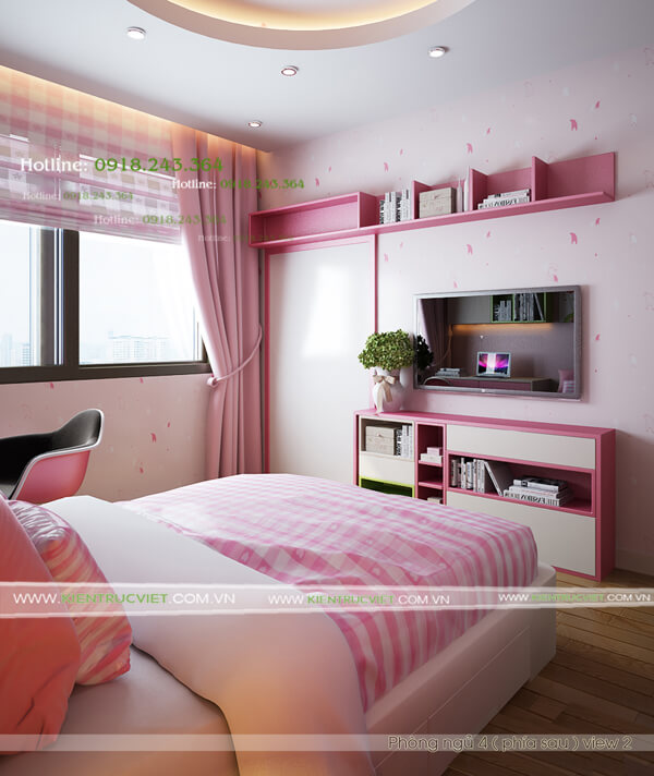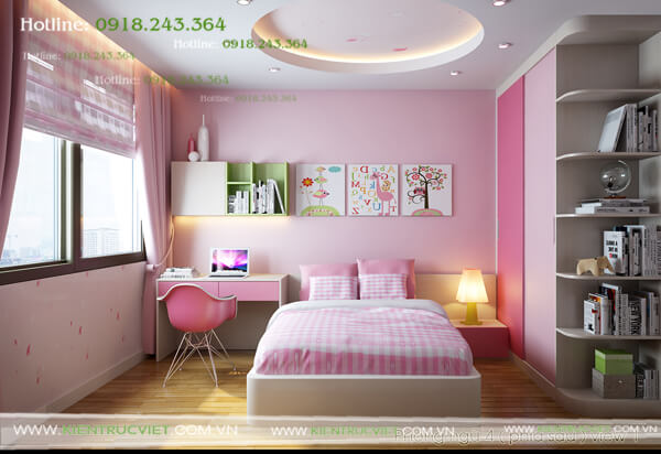 Phòng ngủ baby bé gái với không gian học tập và kệ sách trong phòng