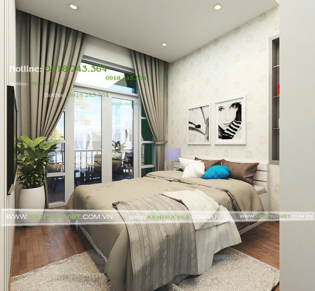 Phòng ngủ lầu 1 với view nhìn 2 từ ban công đến cửa vào chính