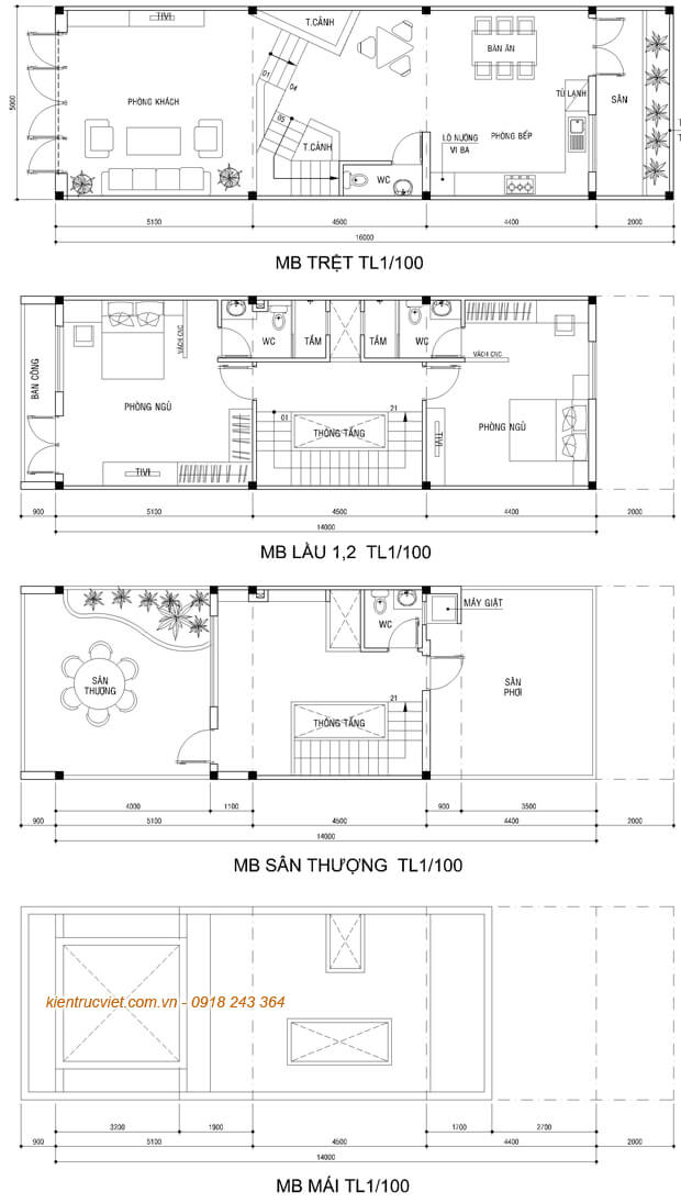 Mặt bằng thiết kế kiến trúc bố trí không gian nhà 4 tầng 5×16