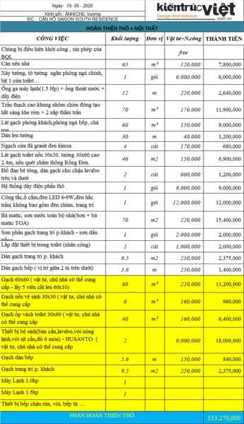 Bảng dự toán hoàn thiện phần thô với gói 133 triệu