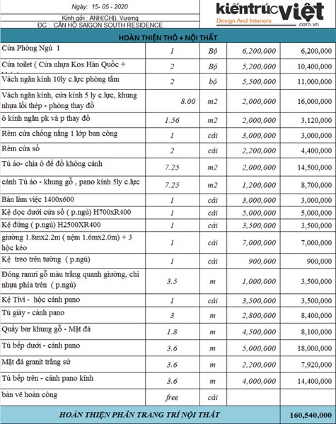 Bảng dự toán chi phí cho phần thô và hoàn thiện nội thất căn hộ 2 phòng ngủ sẽ được chi tiết mô tả bên dưới, nhằm giúp gia chủ có những dự trù chi phí cho căn hộ của mình. Quý gia chủ có thể tham khảo các gói hoàn thiện nội thất căn hộ 3 Phòng Ngủ Palm height, Keppel Land, Mai Chí Thọ, Quận 2