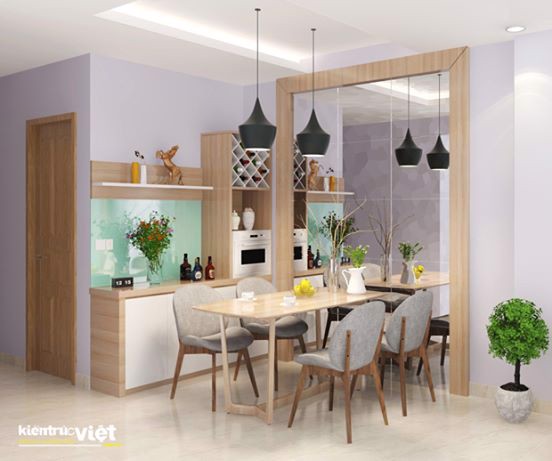 Vách ốp trang trí, kệ tủ cho không gian phòng ăn của căn hộ 70m2.