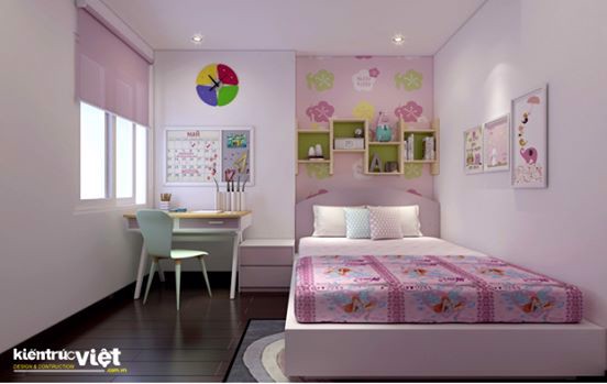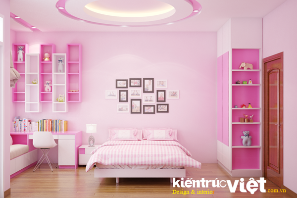 Mẫu số 04: Phòng ngủ cho bé gái bao gồm các hạng mục nội thất như: Giấy dán trang trí/ lăn sơn lại tường/ hệ tủ quần áo kết hợp kệ trưng bày và tủ kho sát trần, bộ bàn học tập kết hợp kệ sách, 1 giường ngủ 1,6m, 1 tag đầu giường và 1 băng ghế sofa thư giản. Với hai tông màu chủ đao là trắng và hồng, vật liệu MDF phủ malamin bảo hành 2 năm.