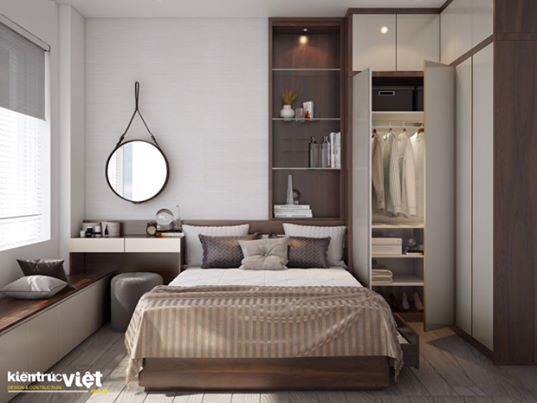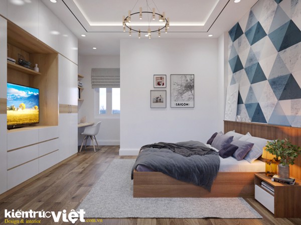 Mẫu số 01: Phòng ngủ master với hệ thống tủ quần áo kết hợp kệ ti vi.Vách ốp trang trí đầu giường, giấy dán tường.