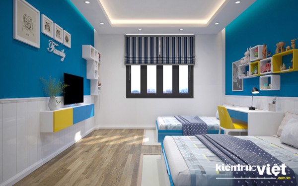 Mẫu số 05: Phòng ngủ cho bé trai bao gồm các hạng mục nội thất như: Giấy dán trang trí/ lăn sơn lại tường/ hệ tủ quần áo kết hợp kệ trưng bày và tủ kho sát trần, bộ bàn học tập kết hợp kệ sách, 2 giường ngủ 1,6m. Với hai tông màu chủ đao là trắng và xanh, vật liệu MDF phủ malamin bảo hành 2 năm.