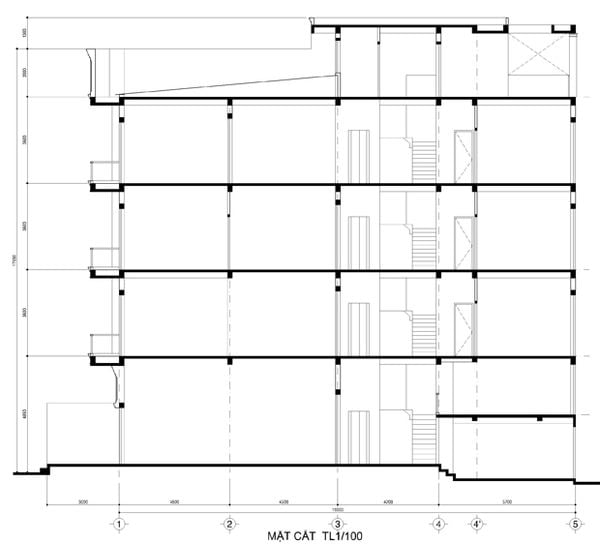 Mặt cắt Thiết kế nhà 4 tầng 5mx20m
