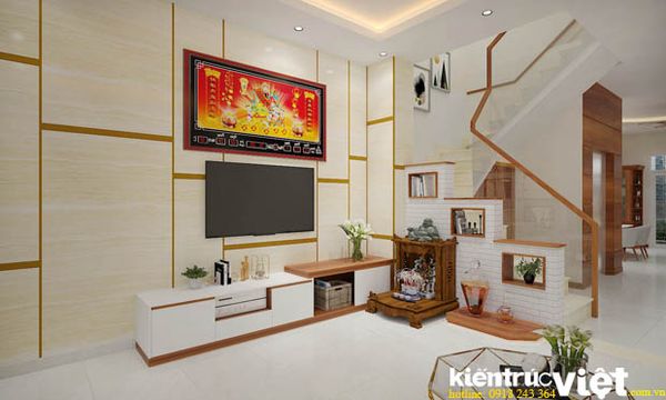 Vách trang trí tường tivi là điểm chấn chính của ngôi nhà phố này. Vật liệu ốp dễ cho việc vệ sinh và tại điểm nổi bật qua viền nhôm ánh vàng rất nổi bật.