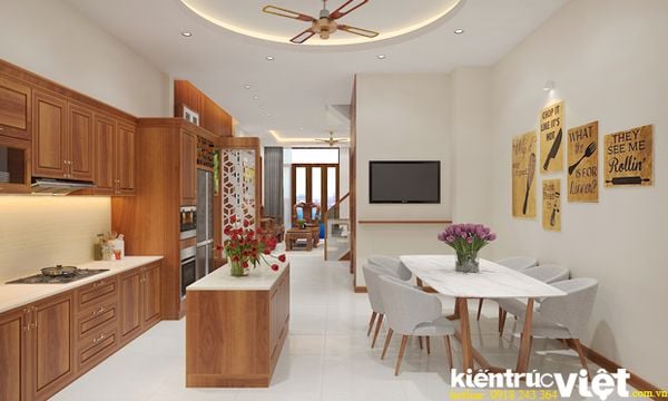 Không gian Bếp và bàn ăn liên thông tạo sự ấm áp.