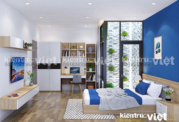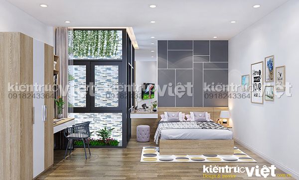 Nội thất phòng ngủ master với view lấy sáng ở giếng trời, nội thất trẻ trung đơn giản với tủ kệ tối giản.