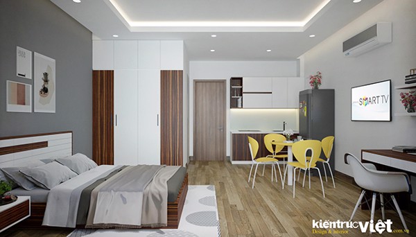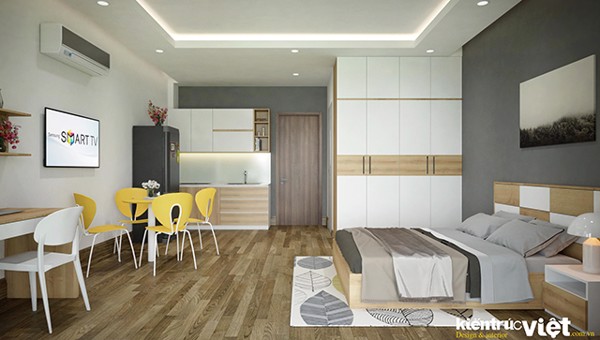 Mẫu nội thất phòng ngủ có không gian ở và bếp