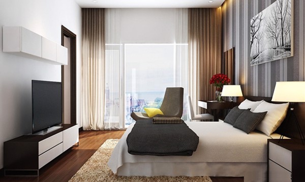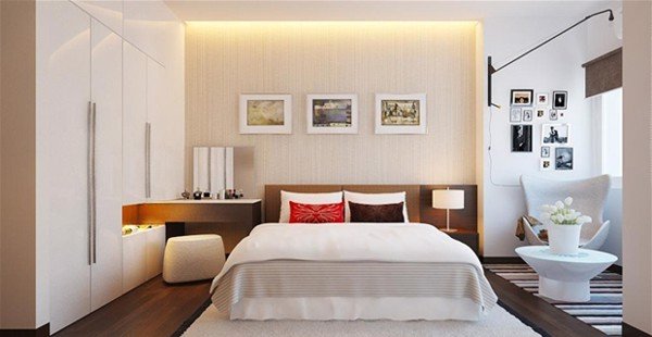 Không gian phòng ngủ sử dụng tông màu trắng làm chủ đạo có kết hợp cùng một vài màu khác để tạo nên sự ấn tượng.
