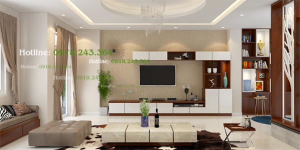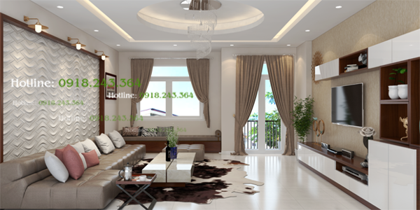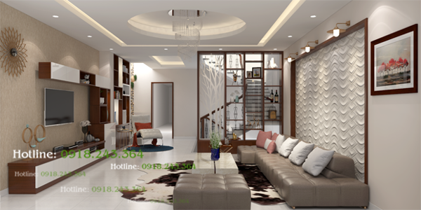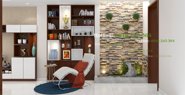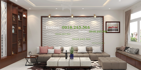Tường chính tại phòng khách được thiết kế bằng đá trắng dạng hoa văn lượn sóng rất đẹp mắt. Tủ đồ âm tường có nhiều ngăn đựng để trang trí đồ vật cho phòng khách thêm đẹp hơn.