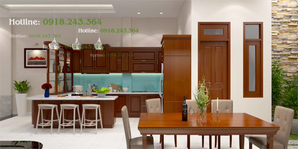 Khu vực bàn ăn với bếp ăn cũng có lợi thế về mặt diện tích nên kiến trúc sư thiết kế đảo bếp liền kề với khu vực nấu nướng rất tiện lợi. Sử dụng tông màu gỗ nội thất đồng bộ cũng là điểm nhấn cho sự sang trọng nơi đây.