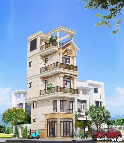 Mẫu nhà ống 5 tầng -Nhà phố góc ngã ba, 1 trệt 1 lửng 2 lầu và 1 sân thượng