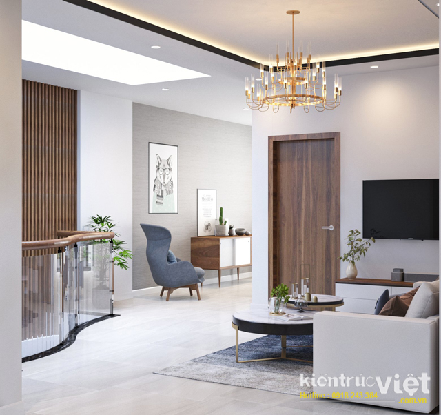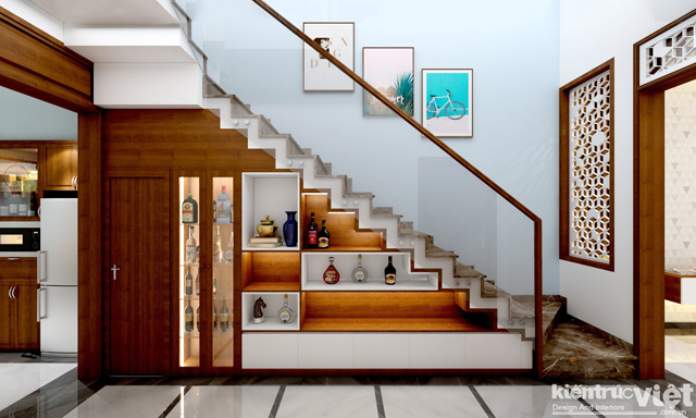 Sau phòng sinh hoạt là sảnh lối thang trên lầu với diện tích góc chết dưới gầm thang được tậng dụng làm không gian trưng bày trang trí, tủ kho.